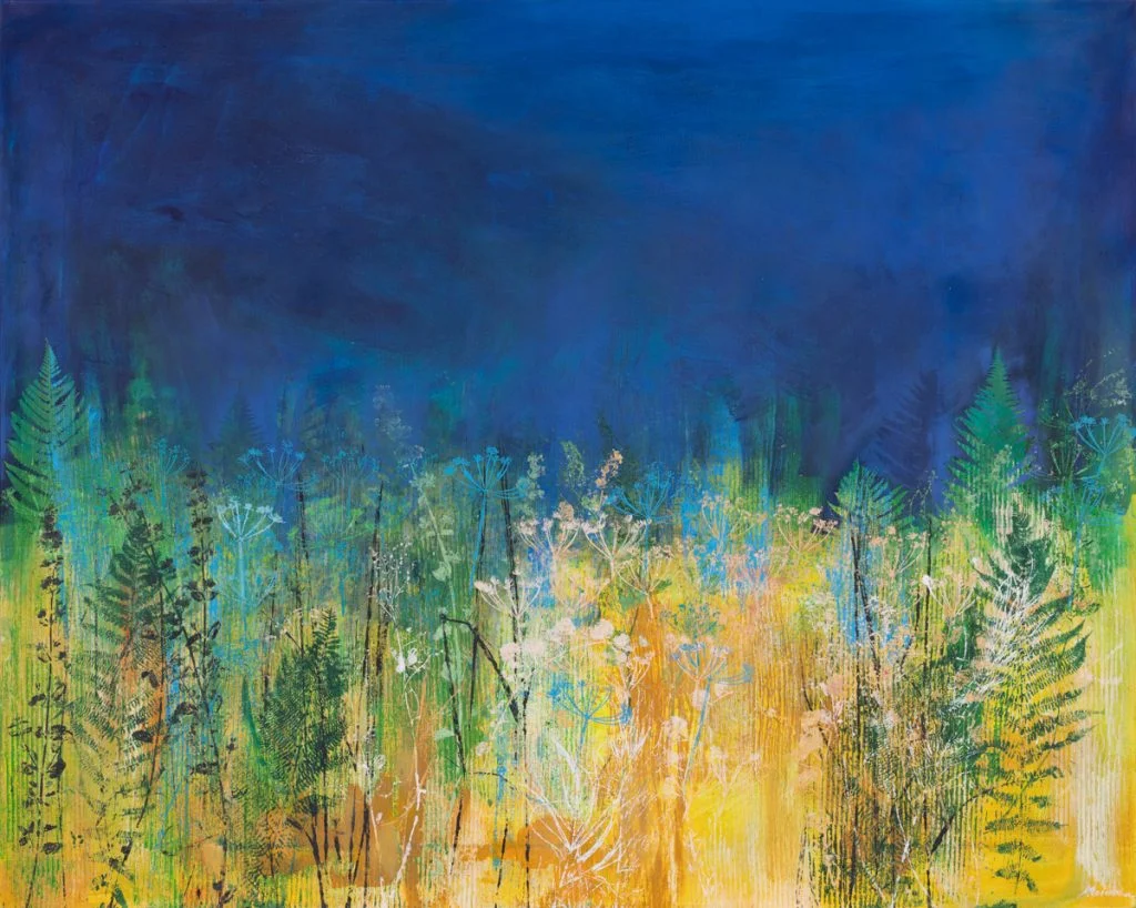 Informacje: akryl, płótno115x144,5, cmsygn. p.d.: ARościecha, opisany na odwrocie: Agata Rościecha-Kan, "Szafirowa łąka nieba", 144x115 cm, akryl, 2024